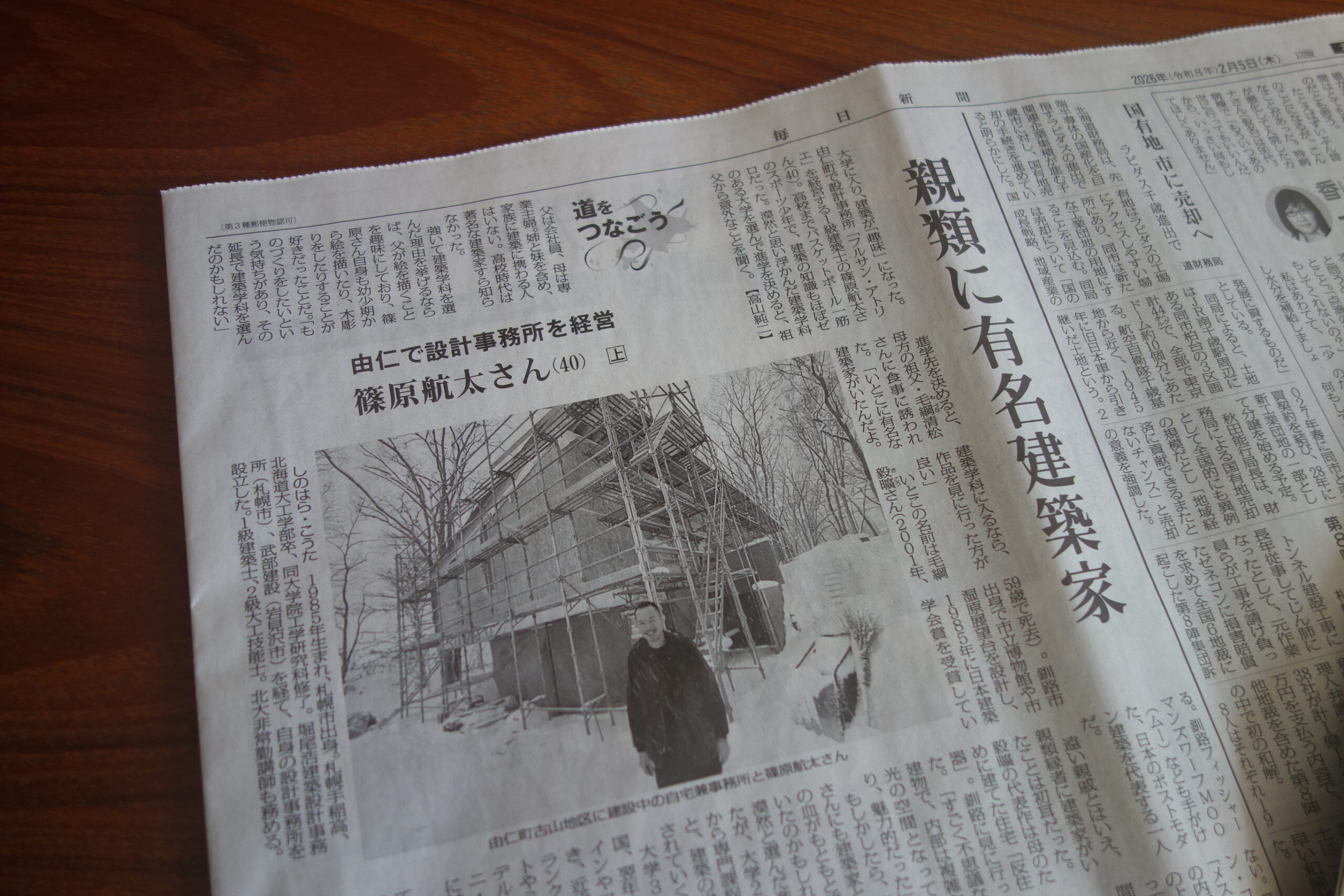 馬追丘陵の麓にある由仁町古山地区。フルサンとはアイヌ語で「丘のかたわら」を意味します。土地にはそれぞれ歴史や風土があり、その地ならではの自然環境や気象条件を形づくっています。それらを大切思い深く見つめることで、永く愛され、その地の風景となる建築をつくりたいと考えています。自然環境によって育つ植生が様々なように、ここという場所に思いをよせ、地に芽を出す草木のように建つ自然の場をめざします。